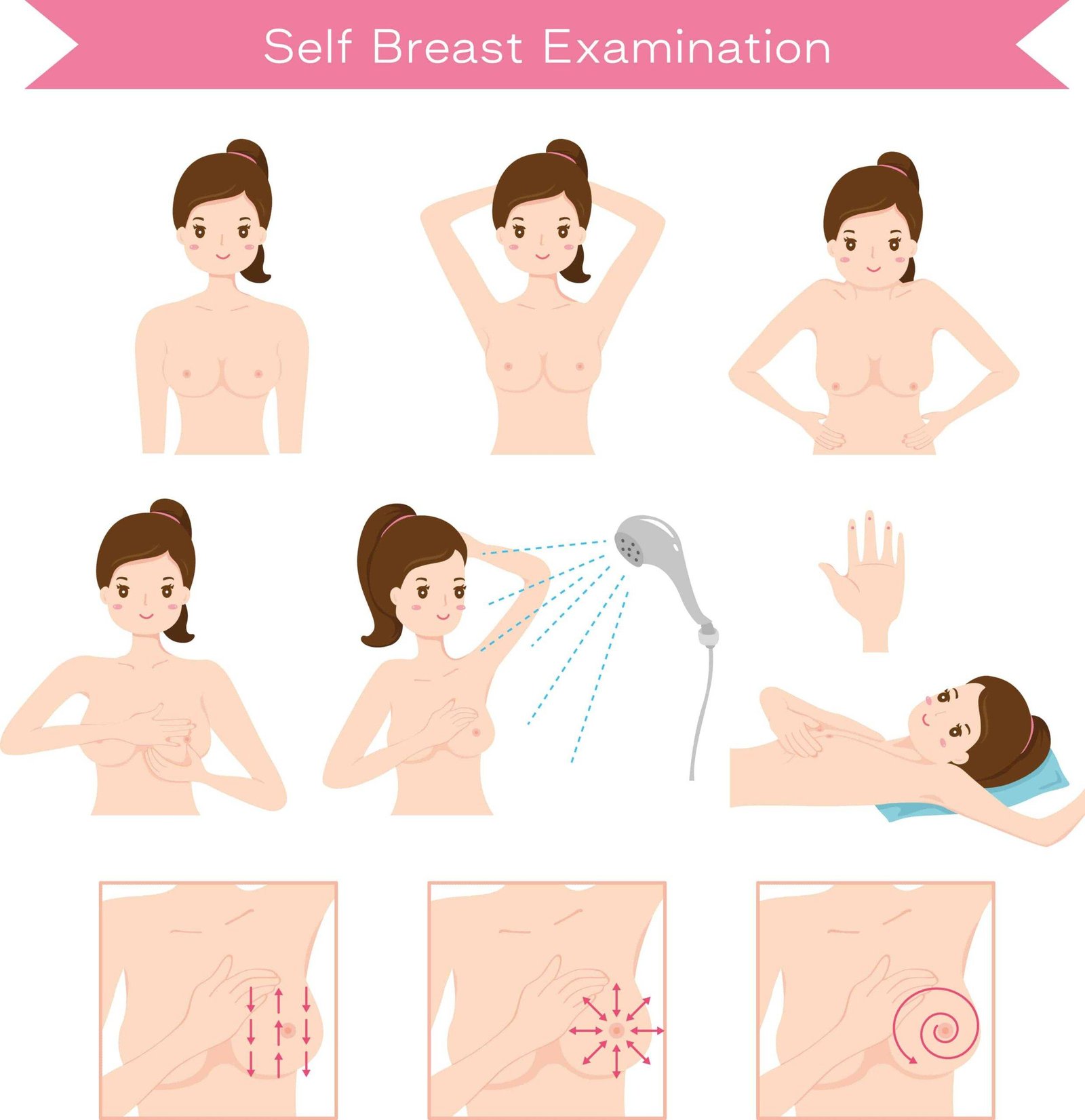 يجب عليك أن تحددي من خلال العينين واليدين ما إذا كانت هناك أي تغيرات في شكل وملمس الثديين باتباع الخطوات التالية: